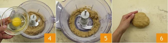 At this point, add the whole egg 4 and blend everything again 5. Then transfer the shortcrust pastry onto a lightly floured surface and work it for a few seconds 6.