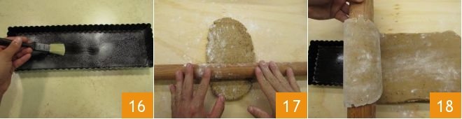 Now, butter a rectangular mold measuring 14x4 inches 16. Take the shortcrust pastry and roll it out on a lightly floured surface 17, to obtain a rectangle about 1/5 inch thick. Using the rolling pin, transfer the dough onto the mold 18