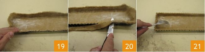 and using your fingertips, make the shortcrust pastry adhere to the mold 19. Remove the excess dough using a small knife 20 and prick the bottom of the tart with a fork 21.