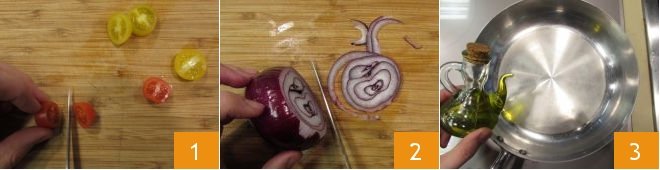 To make the cherry tomato and caper tatin, first wash all the cherry tomatoes and cut them in half 1. Clean and thinly slice the onion 2. In an 11-inch diameter skillet, suitable for oven cooking, pour the olive oil 3,