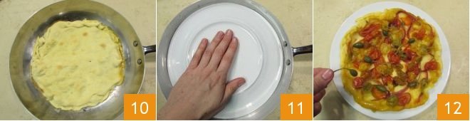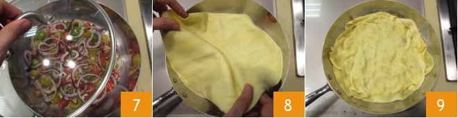 and cook over medium-high heat for 5 minutes with the lid on 7. Then remove the lid and continue cooking for another 5 minutes. After this time, wait another 5 minutes to let the pan cool slightly, then lay the shortcrust pastry sheet over the pan to completely cover the filling 8, fold the pastry along the entire edge 9.