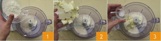To make the tatin of stuffed zucchini flowers, first prepare the spelt shortcrust pastry: in a food processor with a steel blade, add the whole spelt flour and all-purpose flour 1, add the cold butter from the fridge 2 and salt 3