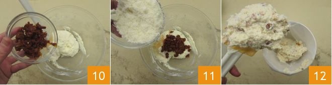 the coarsely chopped sun-dried tomatoes 10, grated Grana Padano 11, salt, and pepper. Mix thoroughly, transfer the mixture into a piping bag 12, and let it rest in the refrigerator while continuing with the rest of the preparation.