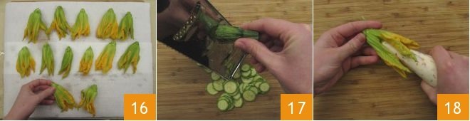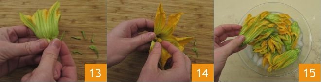 Take the zucchini flowers, shorten the stem, and detach the tips of the peduncle at the base 13, then remove the pistil 14 and immerse the flowers in ice water 15.