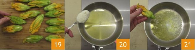 carefully sealing the end to prevent the filling from leaking out 19. Take an oven-safe skillet, add the oil, and sprinkle the bottom with a couple of tablespoons of Grana Padano 20; turn on the medium heat, and as soon as the cheese starts to melt, arrange the stuffed zucchini flowers in a radial pattern inside the skillet 21. Let them cook over medium heat for 2-3 minutes without touching them.