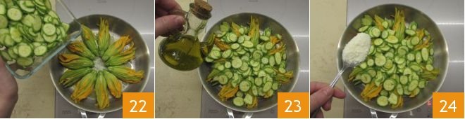 At this point, cover the zucchini flowers with the sliced zucchinis 22, drizzle with a little oil 23, salt, pepper, and another tablespoon of Grana Padano 24, and let them cook for a few more minutes.