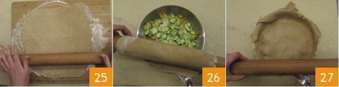 Meanwhile, take the brisè dough from the fridge and roll it out on a floured surface until you get a thin disc larger than the skillet 25. Remove the skillet from the heat, wrap the pastry around the rolling pin, and carefully unroll it over the skillet 26, then trim the edges with the rolling pin to make it fit well 27.