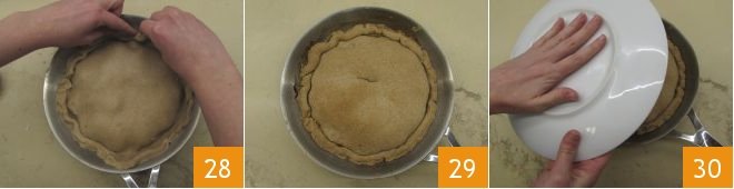 Fold the edges inward to prevent the filling from leaking out from the sides 28, then bake everything in a preheated static oven at 350°F for about 45-50 minutes. After baking, remove the skillet from the oven 29 and wait a couple of minutes, then cover it with a serving plate 30