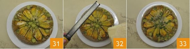 and flip it over with a firm motion 31. After garnishing with a bit more grated Grana Padano 32 and a few fresh mint leaves 33, your tatin of stuffed zucchini flowers will be ready to be served!