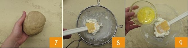 At this point, transfer the dough onto the work surface, shape it into a smooth disc 7, wrap it in plastic wrap, and put it in the refrigerator to rest for about 30 minutes. In the meantime, you can start on the filling for the zucchini flowers: sieve the ricotta into a bowl by pushing it through a fine-mesh sieve with a spatula 8, then add the egg 9,