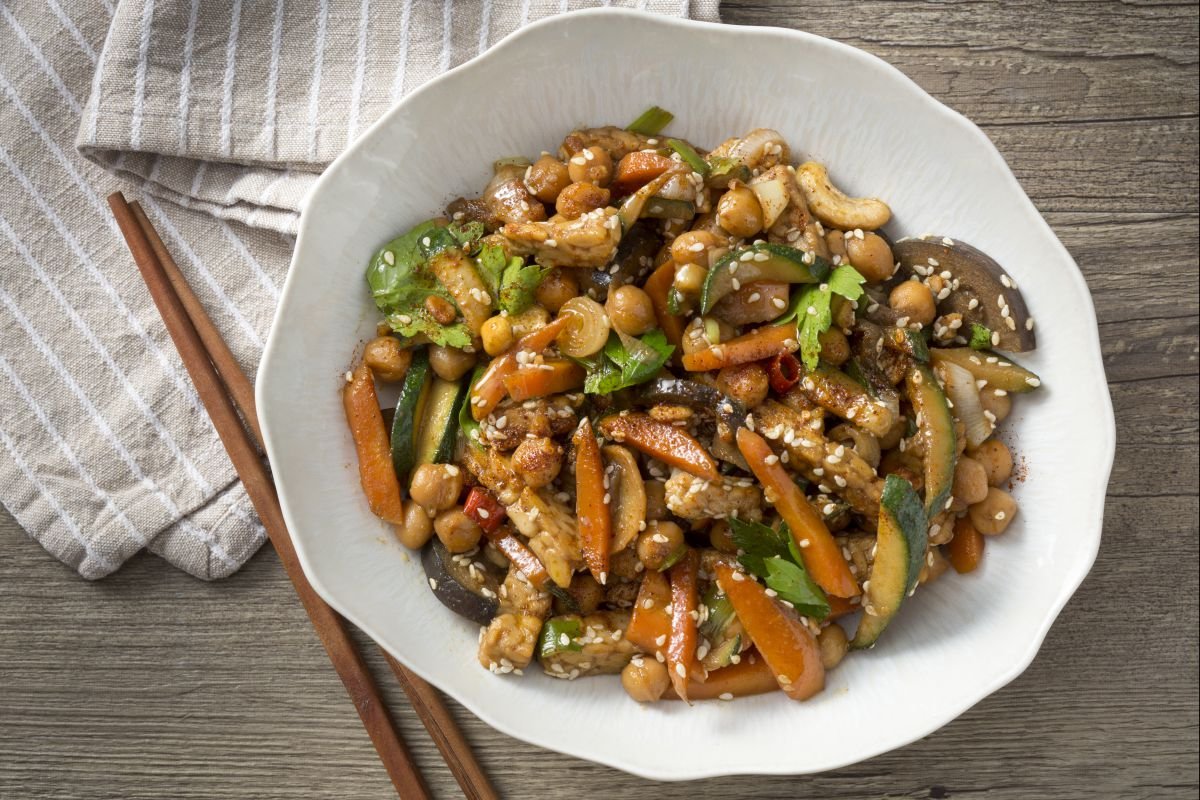 If you’re looking to spice up your meal routine, this Indonesian-inspired tempeh and vegetables dish is just the thing. And look, tempeh recipes are super, super popular in Indonesia. They bring a nutty, hearty flavor and a firm bite, unlike tofu. Really, this dish is for everyone—not just vegetarians or vegans—thanks to its high plant-based protein content, which keeps you full and satisfied. Can't go wrong. The magic happens when you mix tender zucchini, carrots, and eggplant with crunchy chickpeas and cashews. Toss it all together with ginger and soy sauce to create that classic Southeast Asian taste. Pretty simple. And it offers a mix of tangy and savory flavors. In Indonesia, dishes like this are often served with nasi goreng, which really lets those flavors shine.