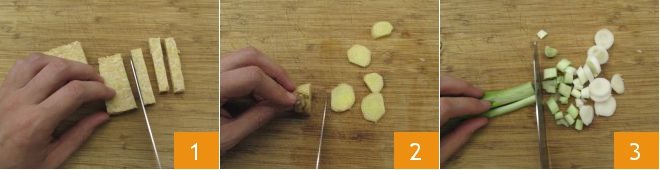 To prepare the tempeh with vegetables, first prepare all the ingredients: cut the tempeh into strips, then slice both the ginger 2 and the scallion 3 and finely chop the fresh chili pepper.