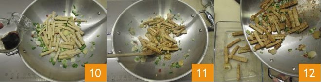 Deglaze with half of the soy sauce 10 and cook for 5 minutes, always on high heat 11. After this time, transfer the tempeh to a bowl 12 and set aside.