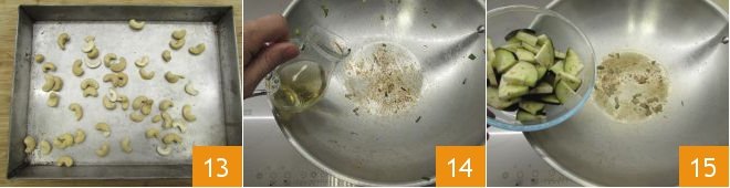 Meanwhile, spread the cashews on a baking sheet 13 and toast them in a preheated static oven at 428°F for 5 minutes, being careful not to burn them. Return the wok in which you cooked the tempeh to the heat and deglaze the bottom with half of the water 14. Once the water has reduced, add the eggplants 15,