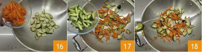 the carrots 16 and the zucchini 17, season with the remaining sesame oil 18 and cook on high heat for about 5 minutes.