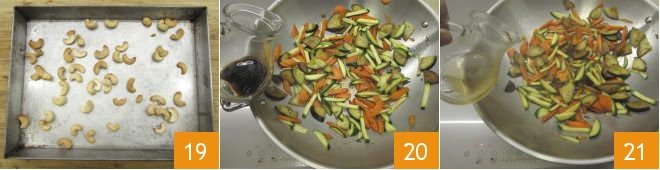At this point, the cashews will be toasted, so remove them from the oven and set aside 19. After 5 minutes, pour the remaining soy sauce 20 and the remaining water 21 into the wok.