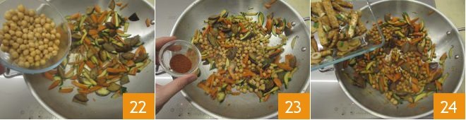 Add the drained chickpeas 22, paprika 23, and tempeh 24, mix well and stir-fry for another minute, then turn off the heat.