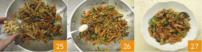 Finally, add the cashews 25, sesame seeds 26, and a few fresh parsley leaves. Serve your tempeh with vegetables while still hot 27!