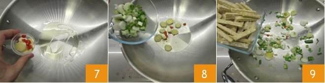 Heat a wok well and pour in half of the sesame oil along with the ginger, chili pepper, and peeled garlic cloves 7. Add the scallion 8 and let it sauté for 3 minutes over medium-high heat, then add the tempeh 9.
