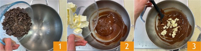To prepare the tender raspberry cake, first melt the chocolate in a bain-marie 1. Add the salted butter cut into pieces 2 and let it melt completely 3.