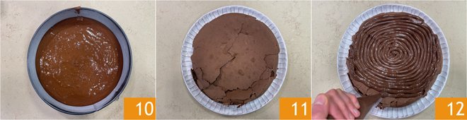 Butter and flour a 10-inch springform pan, pour the mixture into it and level 10. Bake in a static oven at 350°F for 25-30 minutes. Remove from oven 11 and decorate with hazelnut cream 12.