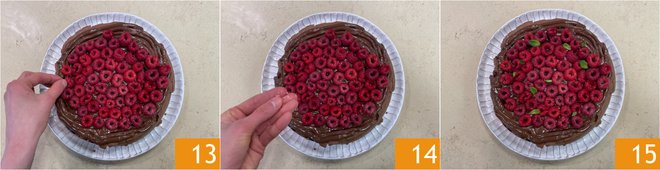 Continue with the raspberries 13, Maldon salt 14, and a few mint leaves. Your tender raspberry cake is ready to be served 15.