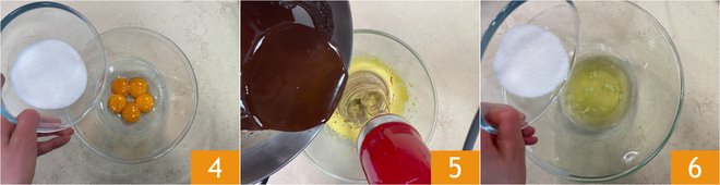Separate the yolks from the whites and place them in two bowls. Add half of the sugar 4 to the yolks and beat with an electric mixer until you get a frothy mixture. Gradually add the melted chocolate while continuing to work with the mixer 5. Add the remaining sugar to the egg whites 6.
