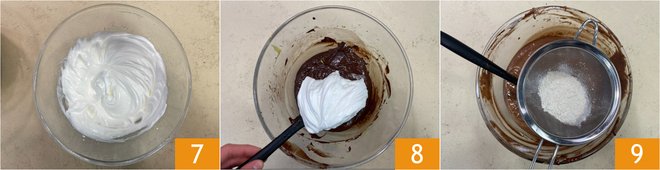 Beat until stiff peaks form with clean and dry beaters 7. Add the egg whites to the chocolate mixture 8 and incorporate with movements from top to bottom to avoid deflating the egg whites. Add the sifted flour 9 and mix gently, again with movements from top to bottom.