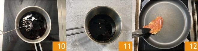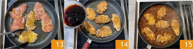 Keep the heat medium-high and do not touch the thighs for at least 6-7 minutes, allowing a nice crust to form, then flip them 13 and cook for another 6-7 minutes on the other side. After this time, pour in the teriyaki sauce 14, lower the heat to medium-low, and turn the thighs in the pan during the last 5 minutes of cooking 15.