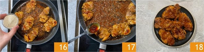 At this point, add the sesame seeds 16 and baste the chicken with the cooking juices to keep it moist 17. Your teriyaki chicken is ready to be served hot 18!