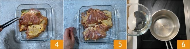 Mix the chicken to flavor the meat evenly 4. Cover with plastic wrap 5 and set aside for now. In the meantime, prepare the sauce: pour the mirin into a saucepan 6.