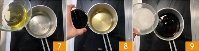 Add the sake 7, soy sauce 8, and sugar 9.