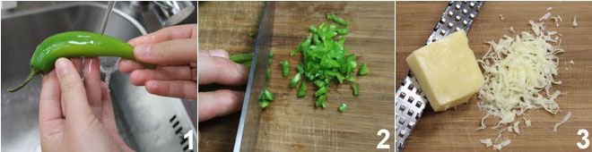 To prepare the tex-mex puff pastry: wash the chili pepper well 1, cut it into small pieces 2, and grate the Gruyère cheese 3.