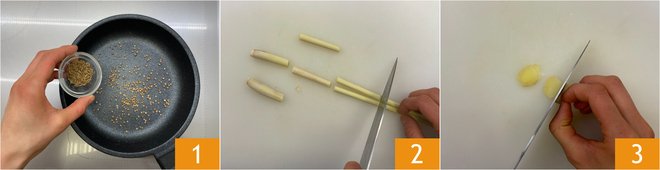 To prepare the Thai green curry, first place the coriander seeds, cumin seeds 1 in a pan, and toast them for a few minutes. Chop the lemon grass into pieces 2 and slice the ginger 3.