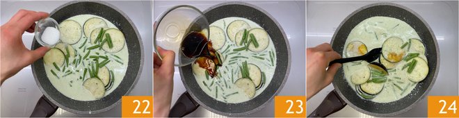 Meanwhile, cut the eggplant into 1/4-inch thick slices 16, trim the green beans and cut them in half 17. Remove the chicken from the pan and set it aside. In the same pan, pour the green curry paste, sauté for a few minutes, then deglaze with coconut milk 18.