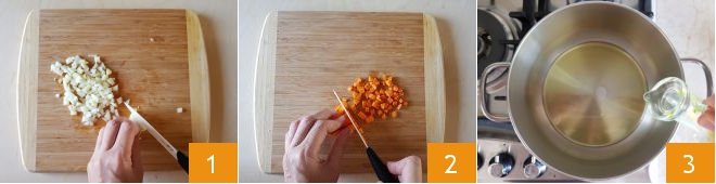 To prepare the three-grain soup with lentils and potatoes, first, take care of the sauté: clean the onion and finely chop it 1, peel the carrots and cut them into strips and then into small cubes 2. Now pour the oil into a pan 3