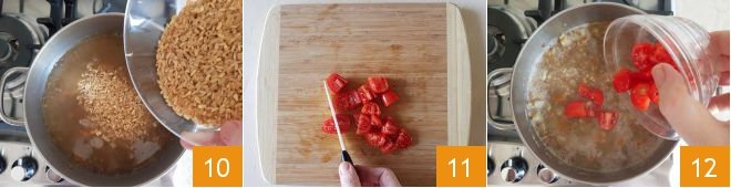 At this point, add the three grains 10, salt, and cook for 8 minutes. Meanwhile, wash the cherry tomatoes and cut them into quarters 11. Add the cherry tomatoes to the soup 12 and cook for another 8 minutes. If the soup dries out too much, add hot water as needed.