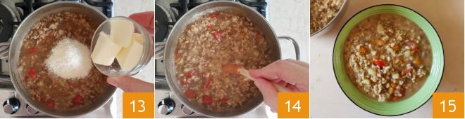 Once cooking is complete, turn off the heat and stir in the butter and cheese 13. Mix 14 and let rest for a few minutes. Serve the three-grain soup with lentils and potatoes hot 15.