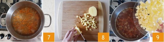 Cook the lentils 7 with the lid on over low heat for 15 minutes. Meanwhile, peel the potatoes and cut them into cubes 8. After 15 minutes, add the potatoes 9 and continue cooking for another 15 minutes.
