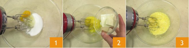 To make thumbprint cookies, first pour the sugar and the egg into a bowl 1 and whisk with electric beaters. Add the softened butter 2 and when you get a smooth mixture 3