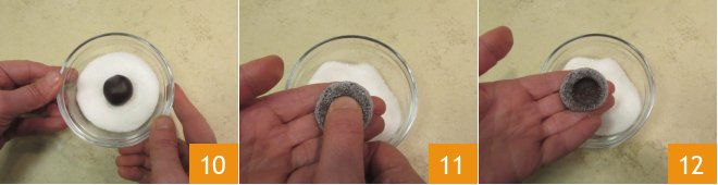 Coat each ball with sugar 10, then make a slight indentation in the center with your thumb 11 to create a cavity 12.
