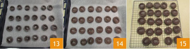 Place the cookies on a baking sheet lined with parchment paper 13: you will get 24 with these amounts. Bake in a preheated static oven at 355°F for 15 minutes. Once baked, remove the cookies 14 and let them cool on a rack 15.