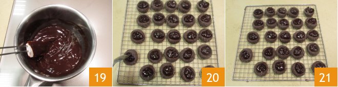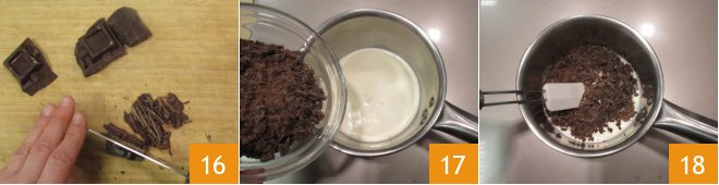 Prepare the ganache: chop the dark chocolate 16, heat the cream in a saucepan and then pour in the chocolate 17 and mix with a spatula 18.