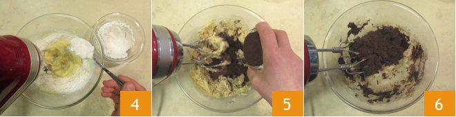 incorporate the flour one spoonful at a time 4 and, while continuing to mix with the beaters, also add the cocoa 5. The mixture will be quite compact 6, you can continue working with the beaters or by hand in the bowl.