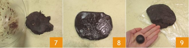 Once compacted, transfer the dough onto a work surface 7, wrap it with plastic wrap 8 and let it firm up in the fridge for 30 minutes. After the resting time, take the dough and break off small portions of 0.5 oz each 9.