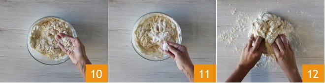 Add the malt powder 10 and fine salt 11. Turn the dough out onto a floured surface and knead with your hands 12