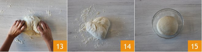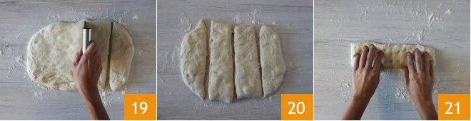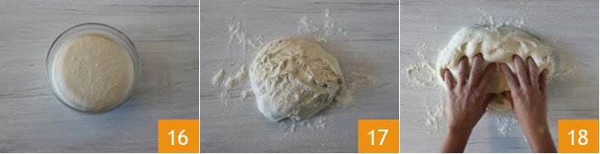 and let it rise until doubled in size 16. It will take about 5 hours. After the resting time, turn the dough out onto a floured surface 17 and gently deflate it with your hands, trying to give it a rectangular shape 18.