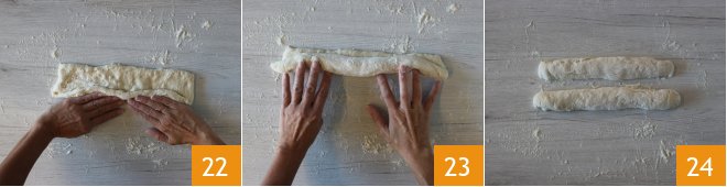 and form the loaves: start by closing the long side of the dough rectangle towards the outside 22 and roll it up completely 23 24.