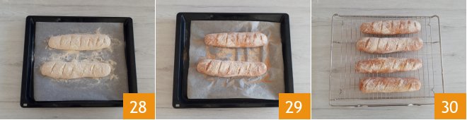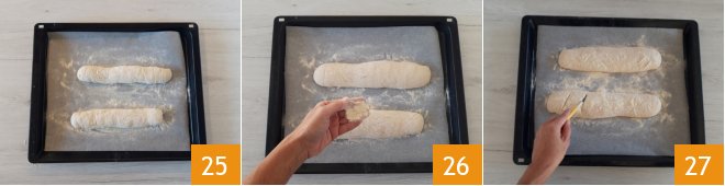 Place the loaves on a baking sheet lined with parchment paper, with the seam side down 25. Let the loaves rise until doubled in size. It will take about 2 hours. Dust the loaves with durum wheat semolina 26 and make cuts on the surface 27,