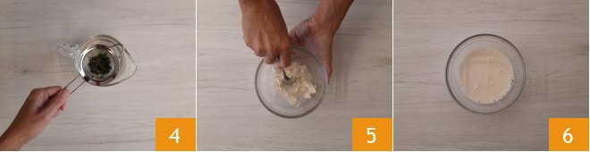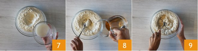 Pour the flour into a bowl and add the dissolved sourdough starter 7. Gradually add the thyme infusion 8, and mix with a spoon 9.